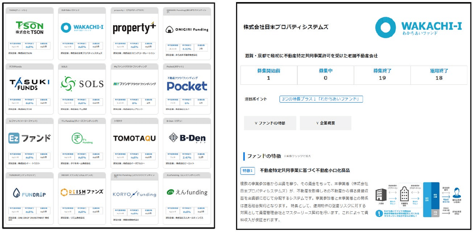 『YANUSY Funding』は、不動産クラウドファンディング事業を行う運営企業の協力のもと、各企業が個別に募集・運用する不動産クラウドファンディングの情報を集約して一括で投資家に提供する総合情報サービスです。『YANUSY Funding』では運営企業と運用ファンドの最新情報を自動的に収集するシステムを構築しており、投資家の皆様はリアルタイムにいつでも最新の不動産クラウドファンディングの情報を閲覧いただくことが可能となっております。