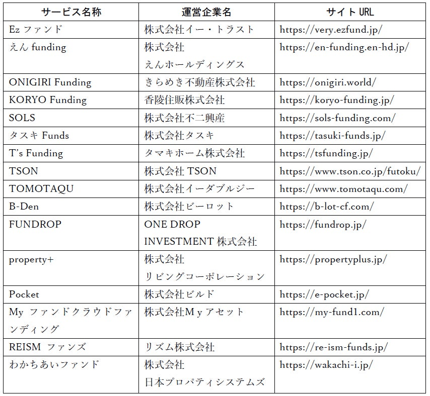 情報を掲載する不動産クラウドファンディングの運営企業は以下の16社となります。