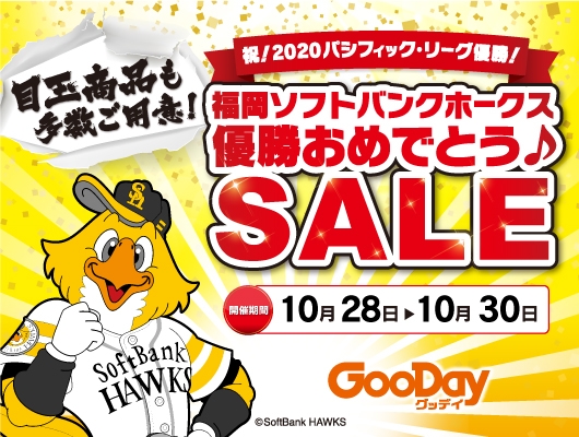 北部九州・山口にてホームセンターグッデイを運営する株式会社グッデイ(本社:福岡市博多区 代表:柳瀬隆志)は、福岡ソフトバンクホークスのリーグ優勝を記念して、『祝!2020パシフィック・リーグ優勝!福岡ソフトバンクホークス 優勝おめでとうSALE』を、グッデイ全65店舗にて10月28日(水)〜30日(金)の3日間限定で開催いたします。
