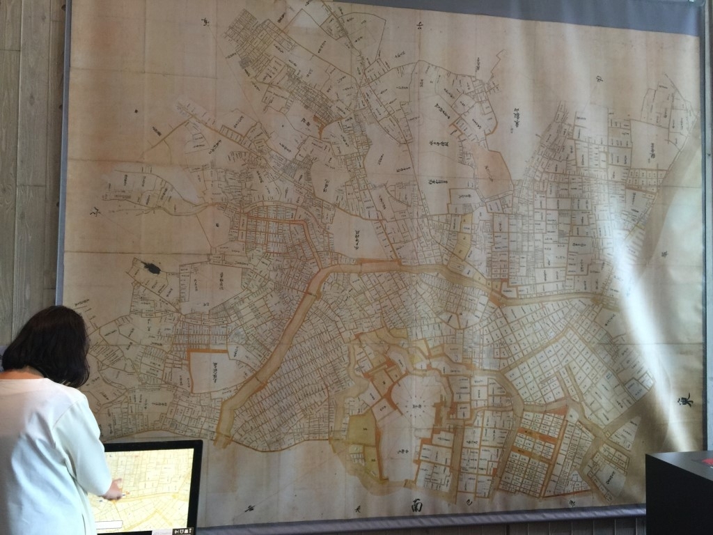 本アプリは、東洋文庫ミュージアムで開催中の「大地図展」(2015年4月22日~8月9日開催)に関連して制作されました。本アプリに搭載されている「江戸大絵図」の複製が実寸大で館内に展示されています。当時と現在を、スマートフォンを持ち込んで見比べることができる他、館内設置のタッチパネルでも見比べることができます。タッチパネルの「江戸大絵図」上には浮世絵を用いた解説等が掲載されています。スマートフォンおよびタッチパネルの「江戸大絵図」はズームすることで詳細まで確認が可能であり、タッチパネルの「江戸大絵図」との見比べに使う現代地図は、オープンな地図プラットフォームOpen Street Map(オープンストリートマップ)を採用しています。