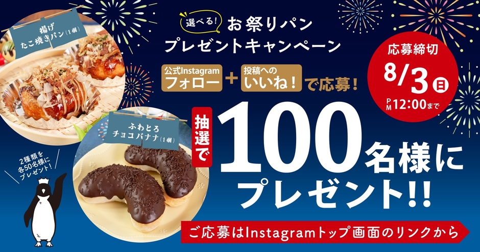 7月25日(金)にペンギン公式Instagramへ投稿されるキャンペーン画像に「いいね!」をして、専用フォームよりご応募いただいたお客様の中から抽選で「揚げたこ焼きパン」もしくは、「ふわとろチョコバナナ」をそれぞれ各50名様(最大100名様)にプレゼントいたします。