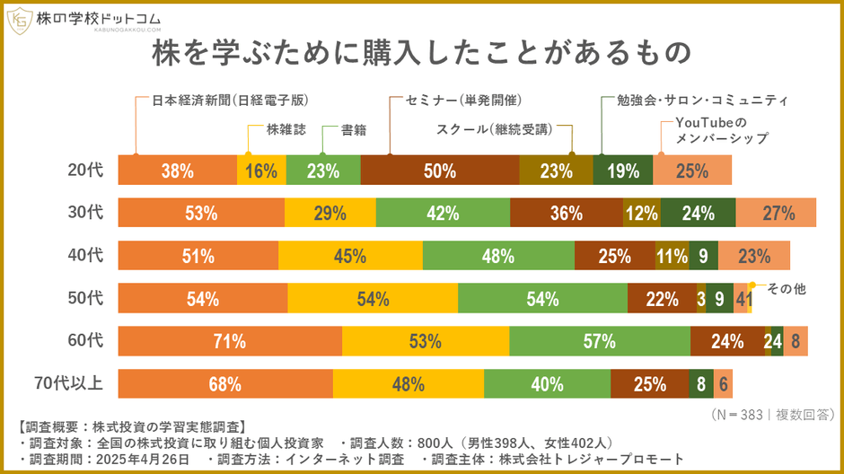 ただ、20代を除けば、どの世代においても「日本経済新聞」に「株雑誌」「書籍」を加えた文字媒体で学んでいる人の割合が依然として多く、個人投資家の根強い支持を得ていることがわかります。