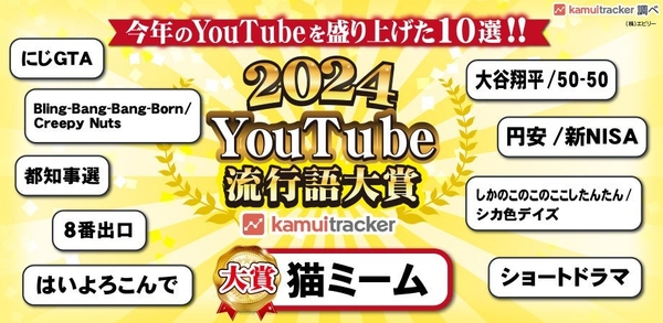 国内最大級のYouTubeデータ分析ツール『kamui tracker(カムイトラッカー)』を運営している株式会社エビリー(本社:東京都渋谷区、代表取締役社長:中川恵介、以下エビリー)は、2024年のYouTube上でトレンドになったキーワードを調査し、YouTube流行語大賞を発表しました。調査にあたっては当社の『kamui tracker』を活用しています。