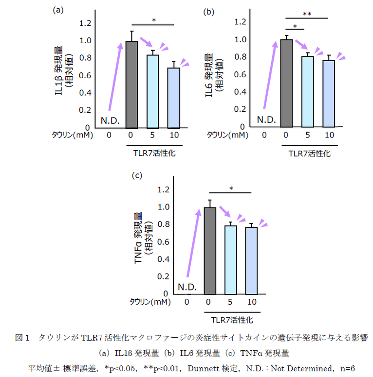 その結果、TLR7活性化によるIL1β、IL6、TNFαの遺伝子発現量の増加は、タウリンによって抑制されました(図1)。
