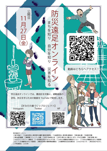 2020年は、新型コロナウイルス感染症拡大防止のため、「防災遠足オンライン」~まちを知り 自分を知り 災害を知る~として墨田区を対象に、避難経路の認知、防災を学ぶための動画を配信します!主催のすみだの巣づくりプロジェクトと協力し、東白鬚公園の防災施設を紹介します。