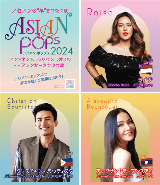 日本を含め、アジアの音楽に世界から熱い注目が集まる中、ASEAN/東南アジア諸国連合のポップスには、新たな音楽的魅力が秘められています。今回は、音楽大国として知られるインドネシアからはライサ、南海の真珠と輝くフィリピンからはクリスチャン・バウティスタ、東南アジア最後の秘境ラオスからはアレクサンドラ・ブンスアイが出演します。