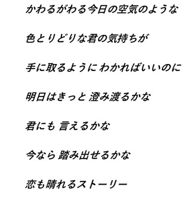 主な視聴者層に近い高校生の男女を主人公に、「ぴちょんくん天気予報」が身近にある世界を描いたアニメーションです。高校2年生で同じクラスの潤(じゅん・男)と爽楽(さら・女)。二人の生活の中にはいつも「ぴちょんくん天気予報」があり、それがきっかけとなって二人の距離を縮めていくストーリーとなっています。軽快なミュージックとアニメの世界観を表した歌詞が、明日への期待感を演出します。