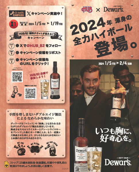 株式会社ハブ(本社:東京都千代田区、代表取締役社長:太田 剛)は、HUB・82で販売中の「Dewar's 12年」を使用した「デュワーズ12年キャンペーン」を2024年1月5日(金)から2月4日(日)の期間で開催いたします。昨年度、好評をいただいたDewar's Triple Campaignに加え、今回はインフルエンサー ちゃんぽんちから氏とのコラボレーションを企画しております。