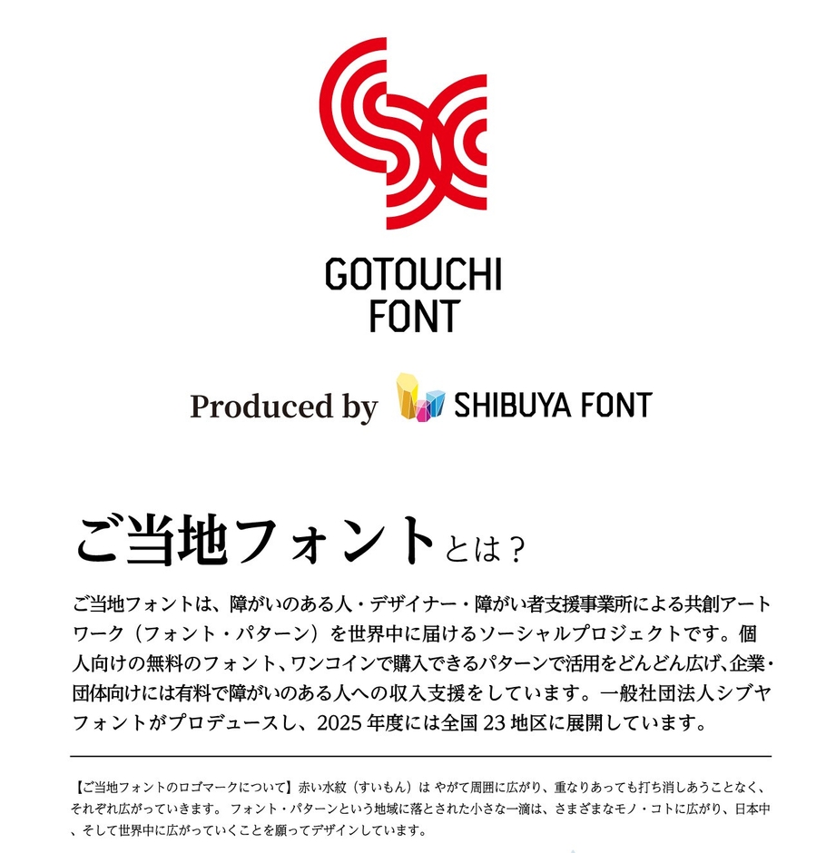 大阪のご当地フォントである「なにわふぉんと」は、東京・渋谷発「シブヤフォント」を中心とした共創アートプロジェクトのひとつとして日本中・世界中の障がいのあるパラアーティストとデザイナー、支援事業所がタッグを組み、無料のフォントで活用の輪をどんどん広げ、有料のパターンで福祉に還元する取り組みです。