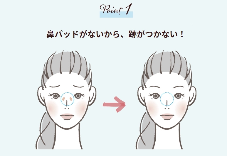 コロナ禍でのテレワークの導入におけるメガネ時間の増加やマスク着用により、今まで以上にメガネの鼻パッド跡が目立つため、鼻についた跡を気にされる方が増えています。それらの悩みを解消する女性に嬉しいメガネです。