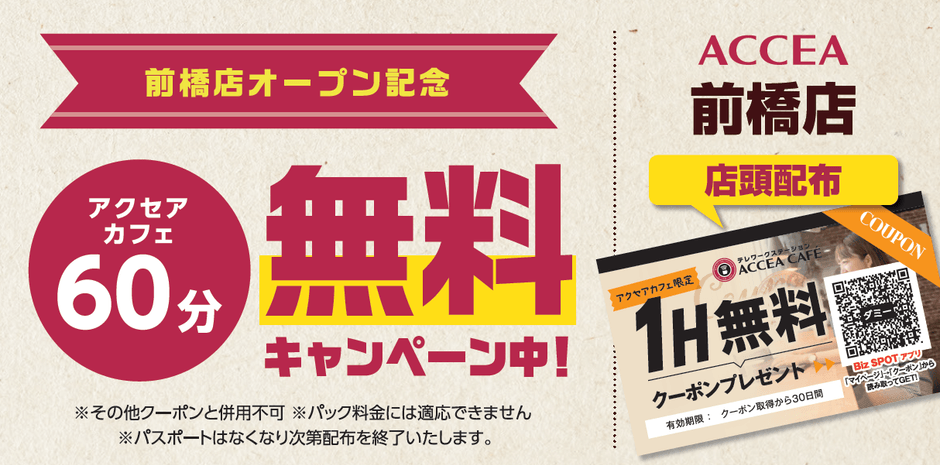 コワーキングスペース「ACCEA CAFÉ(アクセアカフェ) 」が1時間無料で使えるクーポンをアクセア前橋店店頭にて配布いたします。スタッフまでお申しつけくださいませ。