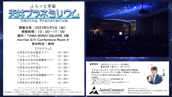株式会社アストロコネクト(本社:神奈川県川崎市多摩区 代表取締役:荒井大作、以下、アストロコネクト)は、東京・立川に2023年3月にオープンした「me:rise 立川 Conference Room」にて、未就学児・小学生を対象にした「ふらっと宇宙」を開催します。
