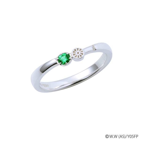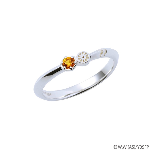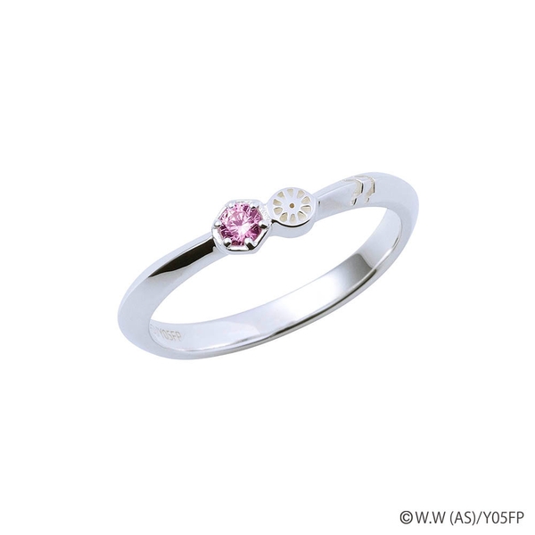 V字フォルムのリングにタイヤと校章モチーフ、ジャージのラインを取り込み、イメージカラーストーンをセット。