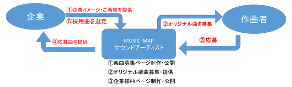 みんなのおススメ(オリジナル)音楽を投稿・紹介するサイト「ミュージックマップ」では、企業様の広告、特に動画やプロモーションビデオ等に使用する音楽が、著作権等の関係で探しにくく、また一般の作曲家のオリジナル曲の活用の場が少ないことから、新企画をスタートするに至りました。この企画に参加されることにより、新進音楽家の支援にも役立ちます。動画制作会社も音楽に関しては、大抵、オリジナル楽曲ではなく、既成のフリー音楽素材を使用しています。