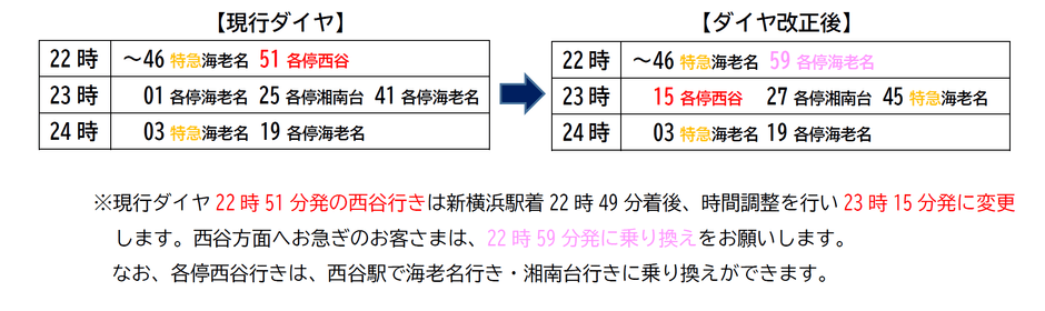 現在の湘南台駅5時30分発→平日新横浜駅6時01分着(土休日新横浜駅5時59分着)の東急目黒線直通列車を、湘南台駅5時23分発→新横浜駅5時53分着に変更し、臨時のぞみ号への乗り換えを可能にします。