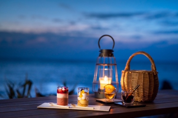 ディナーの後には、海辺で楽しむ「お散歩スイーツセット」を提供します。バスケットで用意するスイーツは、マンゴーとパッションフルーツを飾った爽やかなレモンクリームと、ラズベリーのムースとバラが香るブランマンジェに苺を飾った小さな筒状の2種類のクープです。一緒に味わうドリンクは、ハーブティやホットワインから選ぶことができます。