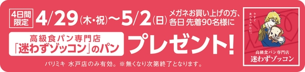4/29(木・祝)~5/2(日)の4日間、メガネお買い上げの方、各日 先着90名様に、今話題の「迷わずゾッコン」の高級食パンをプレゼントいたします! ※無くなり次第終了となります。