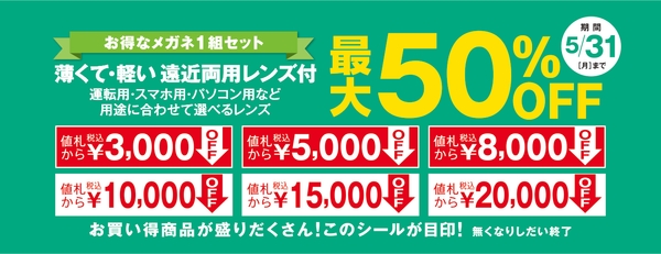 薄くて軽い遠近両用レンズが付いて、メガネ1組 通常価格から最大50%OFF!¥3,000 OFF、¥5,000 OFF、¥8,000 OFFなど、お買い得商品が盛りだくさん!※メガネ1組(フレーム+レンズ)ご購入時の適用となります。