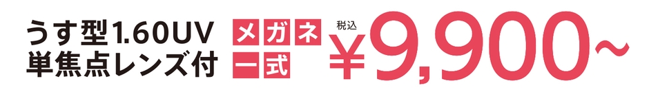 うす型1.60UV単焦点レンズが付いて、メガネ一組 税込¥9,900より、その他豊富にご用意しております。