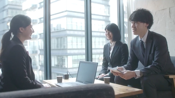 営業マンが仕事に煮詰まって「同業の人に相談したいな」とこぼしたところ、明日香さん演じる職場の後輩が「この方なんてどうでしょう」とビズスポットアプリでササっと検索。営業マンは無事マッチングし、相談相手に出会うことができます。