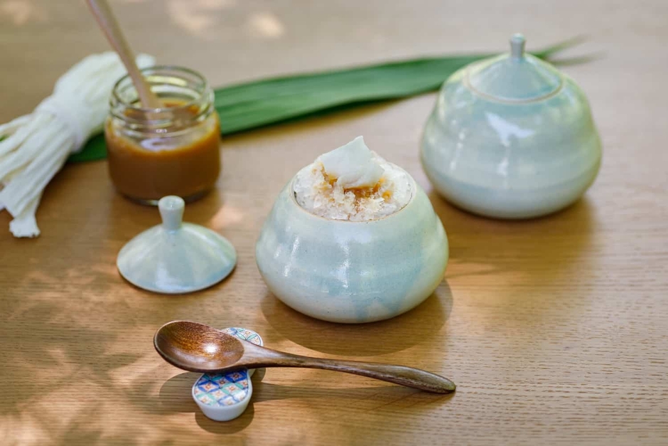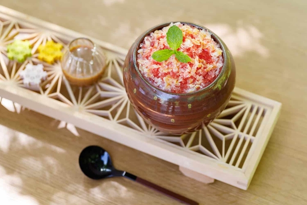 栃木県が国内生産量の95%を誇る「かんぴょう」は、ウリ科の植物である夕顔の実を薄く剥いて干した作物です。界 川治ではその夕顔の形を模した器にふわふわの氷とかんぴょうのシロップ煮を盛り付け、ミルクジャムをひとさじかけて仕上げます。やさしい甘さに癒される一品です。