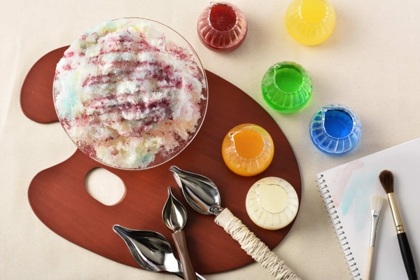 周辺に美術館が多い界 仙石原では、キャンバスに見立てた真っ白な氷を、好みの色のシロップで自由に彩ることができる「アートかき氷」を用意。いちごや青みかんなど鮮やかな色合いのシロップを絵の具のように使い、自分で組み合わせを楽しめます。