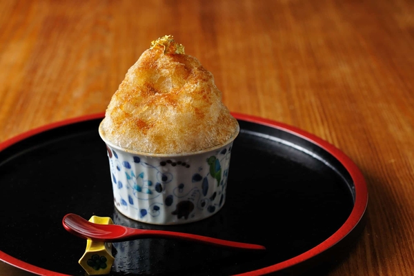 芳ばしい香りとすっきりとした味わいで、江戸時代から長年親しまれている加賀棒茶。その加賀棒茶のシロップと金箔をかけて、華やかな九谷焼の器で味わうかき氷です。