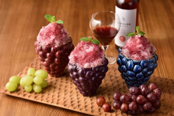 松本市に隣接する塩尻の桔梗ヶ原地域は長野ワイン発祥の地。界 松本では約50種類の桔梗ヶ原ワインを揃えています。かき氷にはその中から、フルーティーな「コンコード種」ワインのシロップを使います。