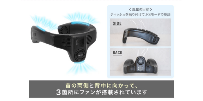 顔の左右と背中の3方向に送風するため、3基のファンを搭載。従来のネッククーラーは顔の左右のみに風が出るタイプが一般的ですが、本製品は背中にも送風されるため、風による涼しさをより実感できます。