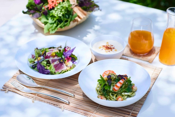 緑が広がる開放的な屋外で、花粉を気にすることなくランチを楽しみます。場所は施設内にある東屋です。高く青い空、白い雲、赤瓦屋根、島の伝統的な作物が育つ畑がすべて見え、沖縄の原風景の中に溶け込んでいることを体感できる空間です。目の前の畑には、島で「命草(ぬちぐさ)」と呼ばれ親しまれるハーブが育ちます。春になって芽吹いた新芽を手に取り、直接香りを確かめながら命草摘みを楽しんだのち、摘んだものが取り入れられたランチを味わうことができます。命草を使ったサラダのほか、島ニンニクのスープ、長命草(ちょうめいそう)のジェノヴェーゼソースのパスタが揃うメニューです。花粉がないからこそ楽しめる植物との触れ合いを体験し、屋外ランチを思い切り満喫します。