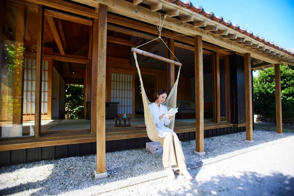 客室は島に吹く心地よい風を感じることができる設計で、窓を開けると南から北へ風が通り抜ける造りが特徴です。島の伝統建築を踏襲して建てられているため、まるで島民になったかのような気分で滞在できます。さらに、島の植物でつくられた香りの良い枕やゴザを使って琉球畳に寝ころんだり、軒下の日陰で使用できるチェアモックでうたたねをしたりするなど、春の心地よい陽気を感じながら過ごします。