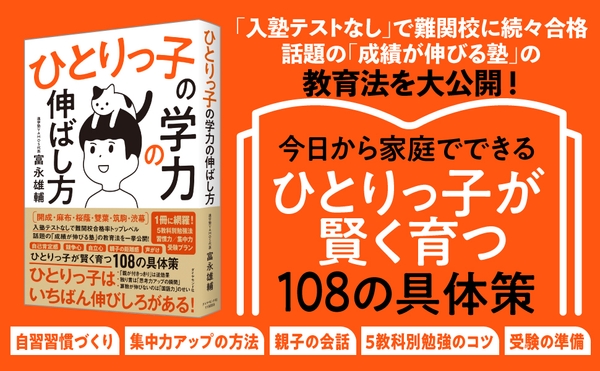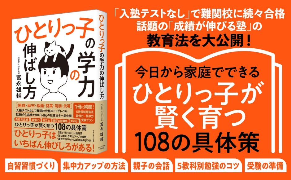入塾テストなしで難関校合格率トップレベルと話題の「成績が伸びる塾」VAMOS代表、富永雄輔さんの最新刊『ひとりっ子の学力の伸ばし方』(ダイヤモンド社)が、8月24日に発売されました。
