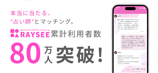 チャット・電話占いサービス『RAYSEE』は、総利用者数が80万人を突破したことをお知らせいたします。(※2022年のサービス開始から2024年5月20日までの累計)