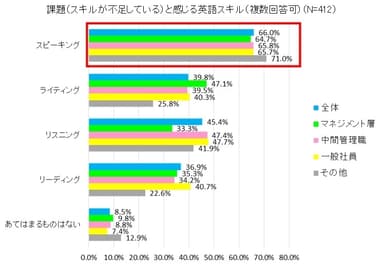 また、役職別で比較すると、役職に関わらず「スピーキング」が課題であるとの回答が1位、2番目に課題とあがったスキルは、(1)一般社員と(2)中間管理職では「リスニング」((1)47.7%、(2)47.4%)、マネジメント層では「ライティング」(47.1%)との回答でした。(「マネジメント層」=「経営者」「役員」「部長」、「中間管理職」=「課長・次長」「係長・主任」、「一般社員」=「一般社員」:以下同様)
