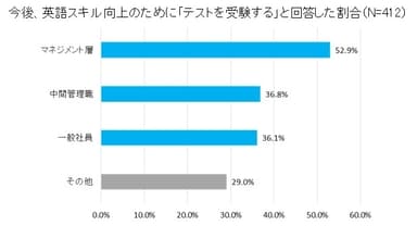 また、マネジメント層(52.9%)、中間管理職(36.8%)、一般社員(36.1%)と、役職が高くなるほど、英語スキル向上のために「テストを受験する」と答えた人の割合は高くなることがわかりました。