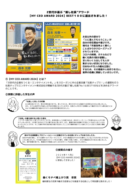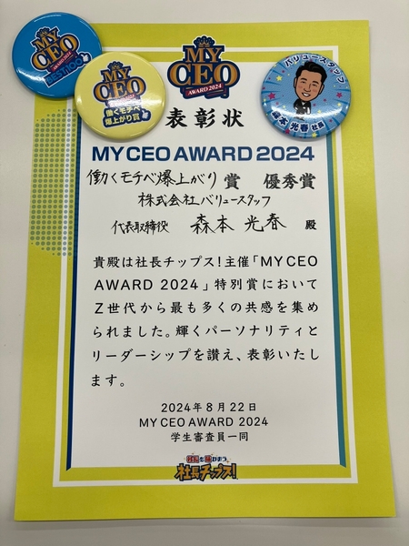 2024年8月22日に開催されたイベント『MY CEO AWARD 2024』に弊社代表の森本がノミネートし、全国ベスト100に選ばれました。また特別賞『働くモチベ爆上がり賞』も受賞させていただきました。