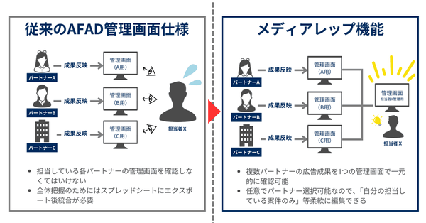 しかし、従来の「AFAD」では複数パートナーがいる場合、各パートナーのパフォーマンスを個別に確認することは可能でしたが、全体の成果を把握するために手間がかかっていました。