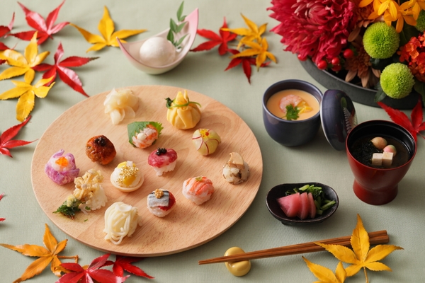 「TAKUMI 会席」では『お昼の天麩羅御膳~秋麗(あきうらら)~ 』の他にも、和洋会席ご膳の秋限定メニューをご用意。2021年9月1日(水)~11月14日(日)の期間は、フォアグラ牛蒡や和牛肉炙りキャビア添えなど料理長が厳選した食材と、ゆり根のモンブランや秋刀魚の炙り酢橘など、秋に旬を迎える食材をふんだんにつかった12種類の手毬寿しで優美な“十二単”を表現した『祝手毬・秋~JUNI‐HITOE御膳~』。昼は御膳、夜は天使海老や銀杏の天麩羅などが味わえる会席のコースと、手毬寿しを秋の行楽弁当として楽しめる『祝手毬・秋~JUNI‐HITOE弁当~ 』をお楽しみいただけます。