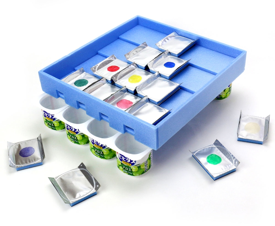 「ビヒダスヨーグルト(4個パック)」のフタは、裏側にヨーグルトがつかないように工夫されている。このフタの上にいろいろな液体をのせて観察すると、水のふしぎな性質が見えてくる!