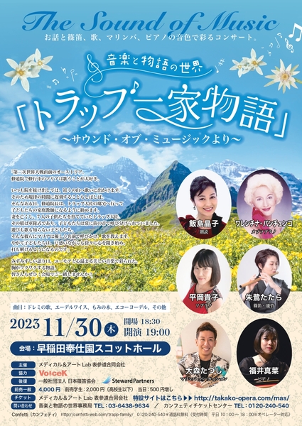 メディカル&アートLab表参道合同会社主催、音楽と物語の世界『トラップ一家物語』~サウンド・オブ・ミュージックより~が2023年11月30日 (木)に早稲田奉仕園スコットホール(東京都新宿区西早稲田2-3-1)にて開催されます。