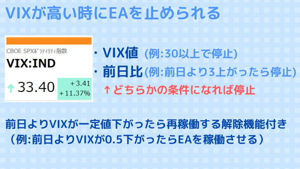 また、「前日からのVIX上昇値」によってEAを止めることもでき、逆に「前日からVIXが下落した時」にEAを再稼働させる機能も付いています。