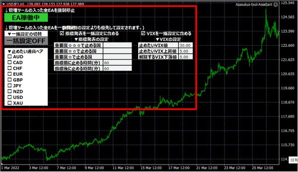 VIX値の一括設定もできるため、「VIXは高いけど情勢が落ち着いたから明日は動かしたい」の時など、停止解除も簡単に行えます。