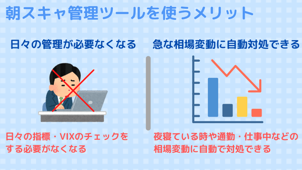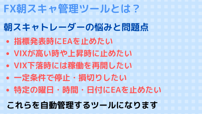 FX朝スキャ管理ツールを使うことで、日々の指標発表チェックや、毎朝のVIXの確認をする必要がないため、朝スキャをEAを管理する手間がかなり減ります。