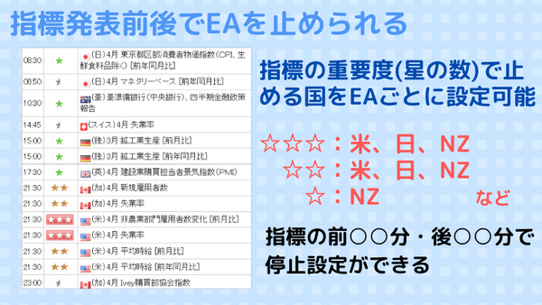 経済指標発表の前後で自動的にEAをストップさせることができる機能です。