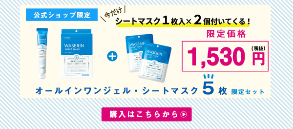 高精製ワセリンに浸透型コラーゲンを配合したシートマスク(3枚入)とオールインワンジェル(50g)のセットに、期間限定でシートマスク2枚が付いた数量限定のお得なセットです。