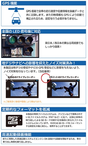 多くのドライブレコーダーではSDカードが破損していても通常通り起動してしまい映像を記録できていないことがあります。本製品では起動時にmicroSDHCカードをチェックし、カードが破損していた場合は液晶表示で異常をお知らせするため、撮り逃しを防止できます。