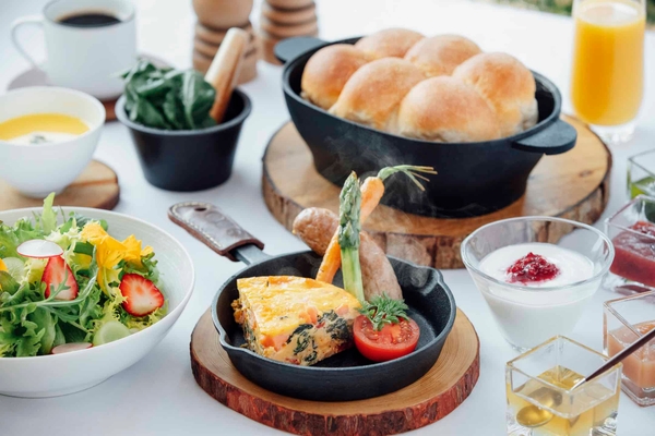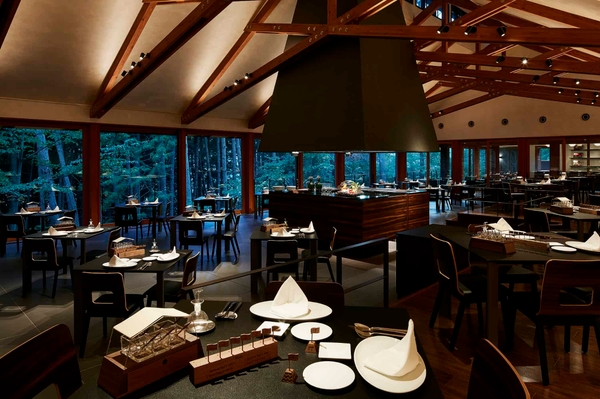 雨で潤った木々を眺めながら、中央のグリル台で焼き上げる豪快なグリル料理や彩り豊かな前菜を囲み、自然の恵みを味わいます。