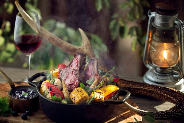 雨がタープに落ちる音を聞きながら、屋外のダイニングで滋味深い狩猟肉を味わうワイルドなディナーです。