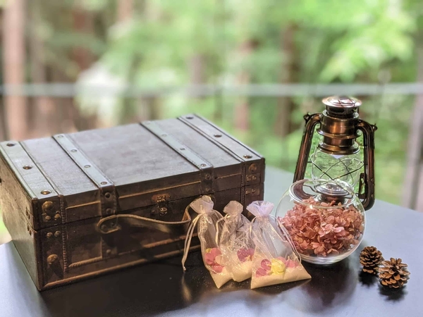 キャビンに戻る前に自身であじさいの花びらを選び、バスソルトを作ります。雨の森で過ごした後の身体を優しく温め、癒します。