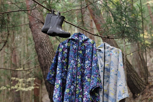 キャビンにポンチョと長靴を用意します。3種類のポンチョから好みのものを選び森へ出かけます。雨の森遊びを盛り上げるのは、雨に濡れるとあじさい色に変わるオリジナルネックポーチです。色の変化を楽しみながら、屋外を満喫できます。